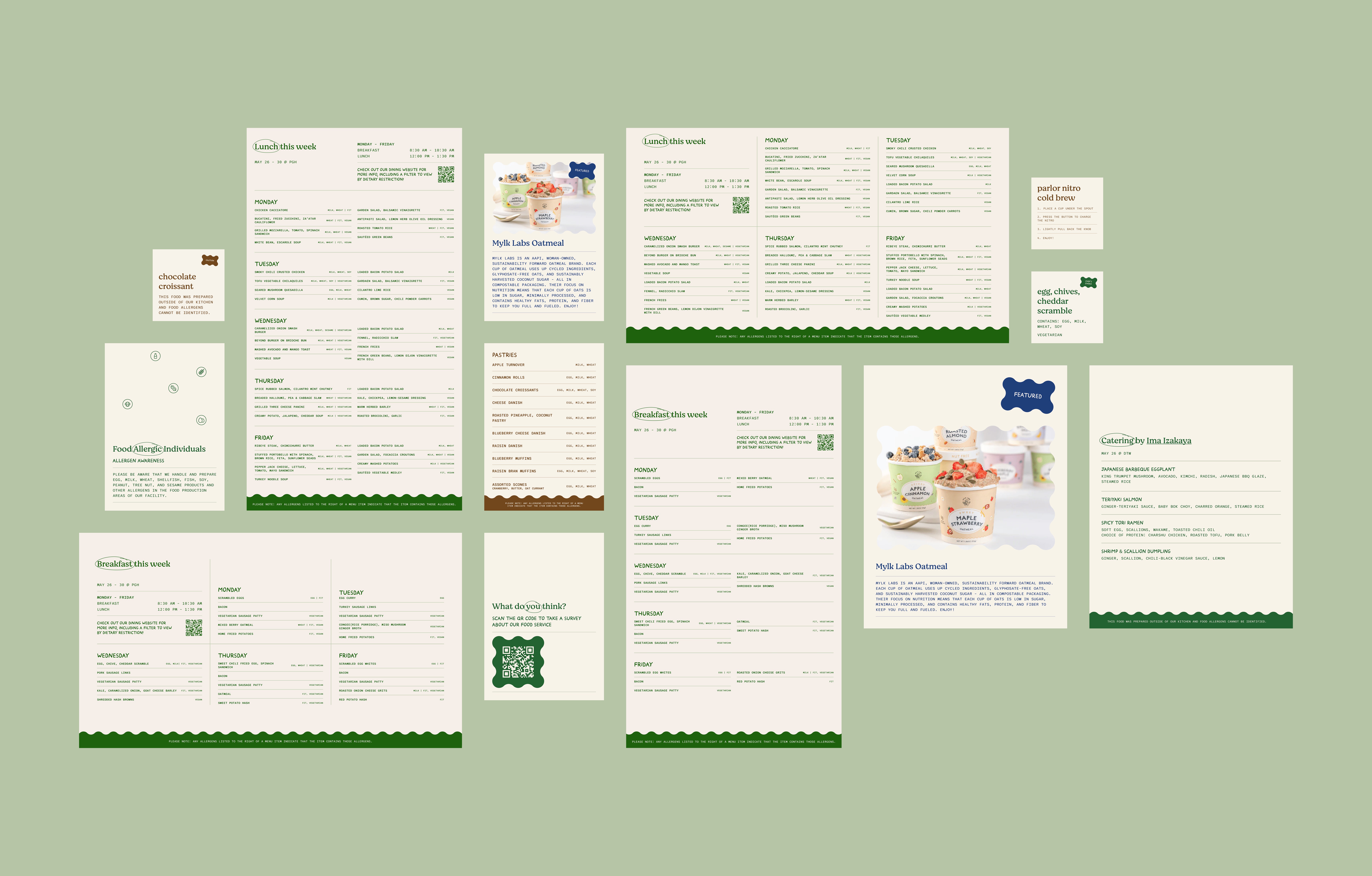 Food and beverage signage package including labels, flyers, digital menus, and an icon system for common dietary allergens and restrictions. Developed brand guidelines and templates for future operations.