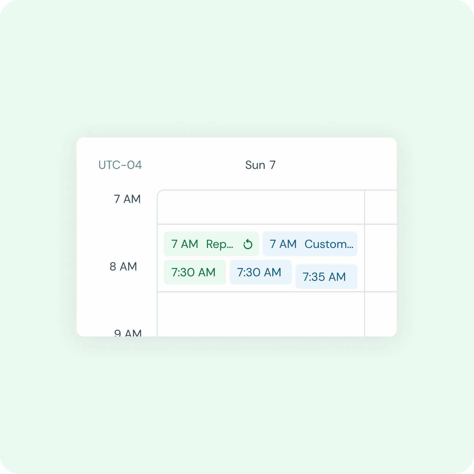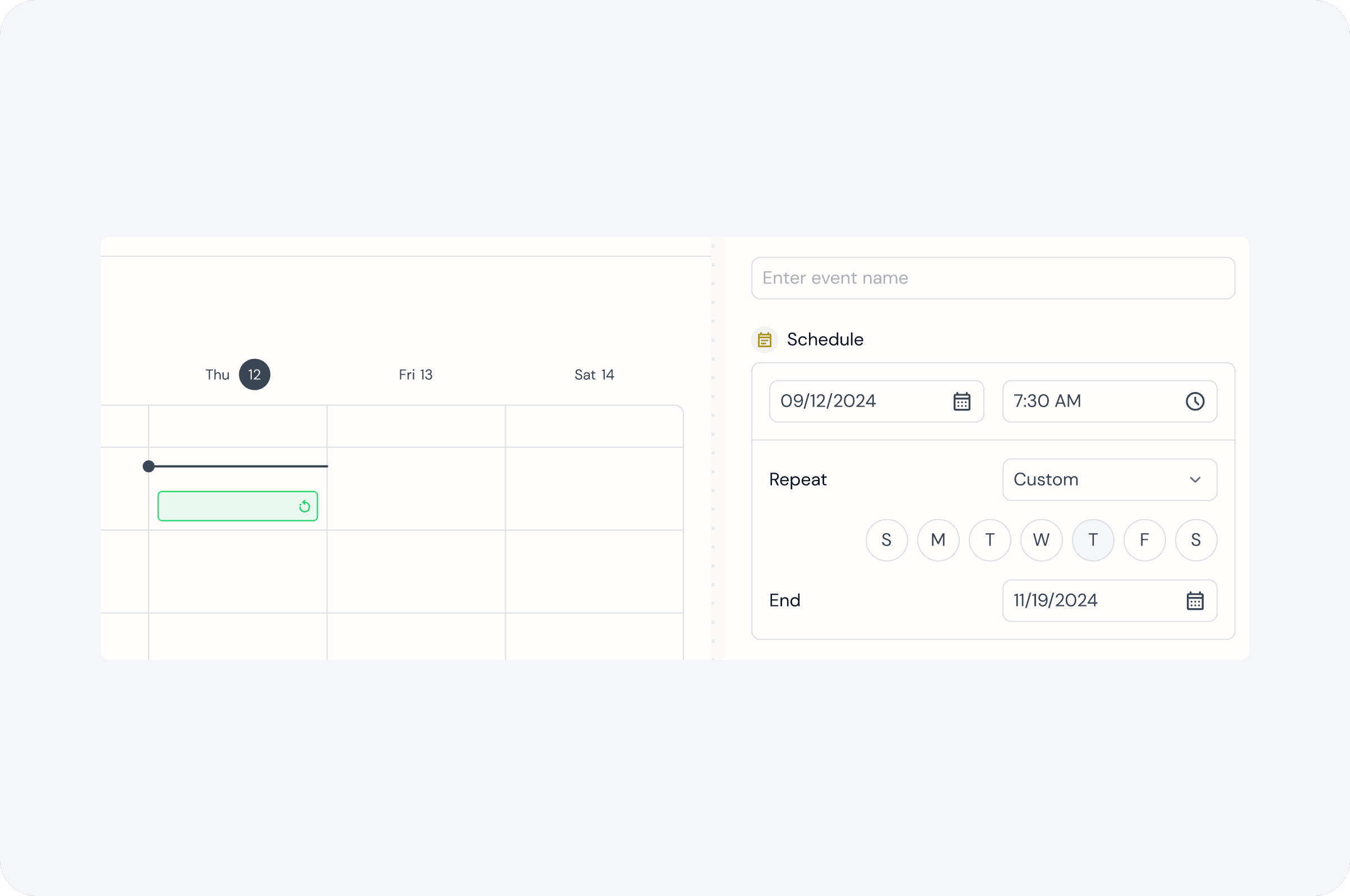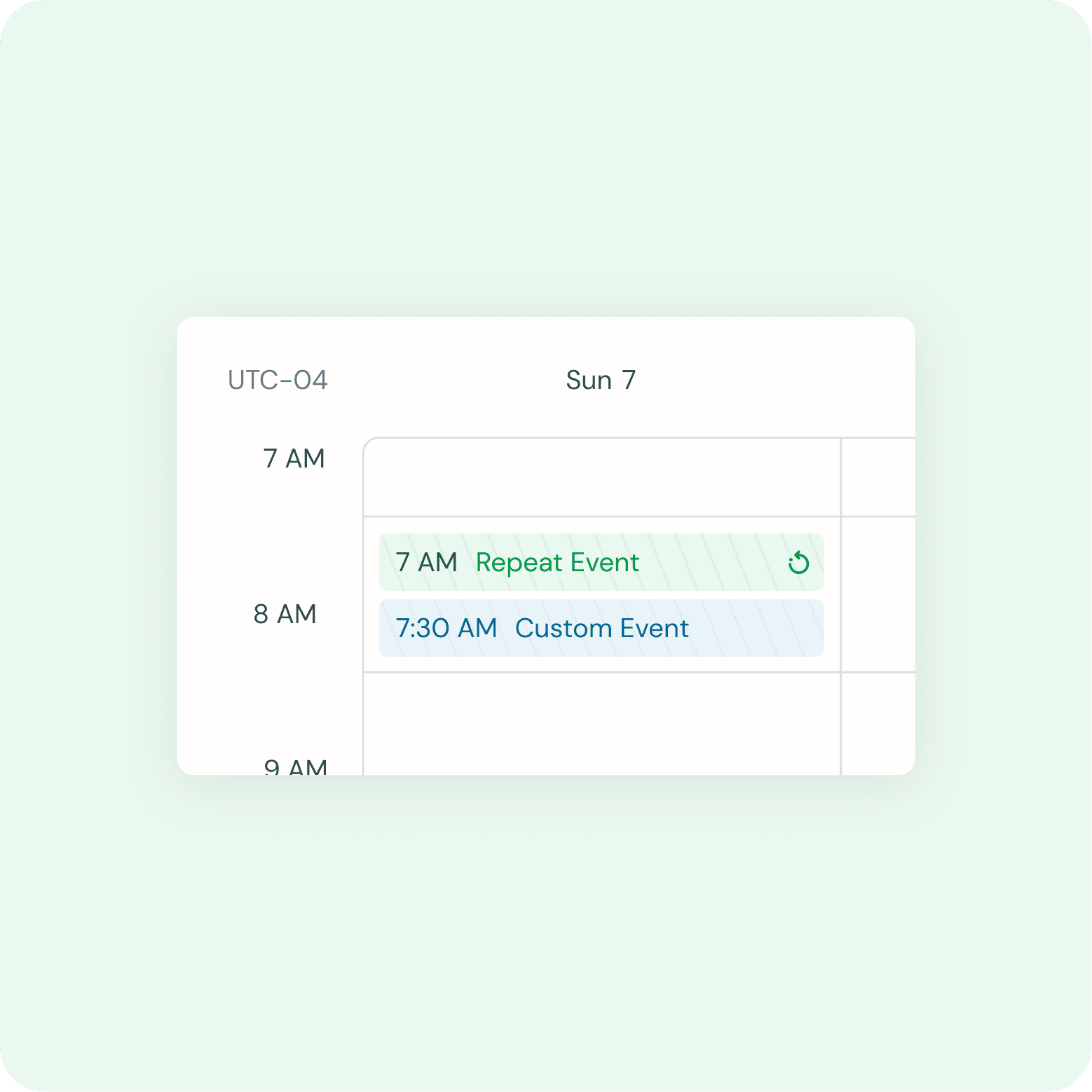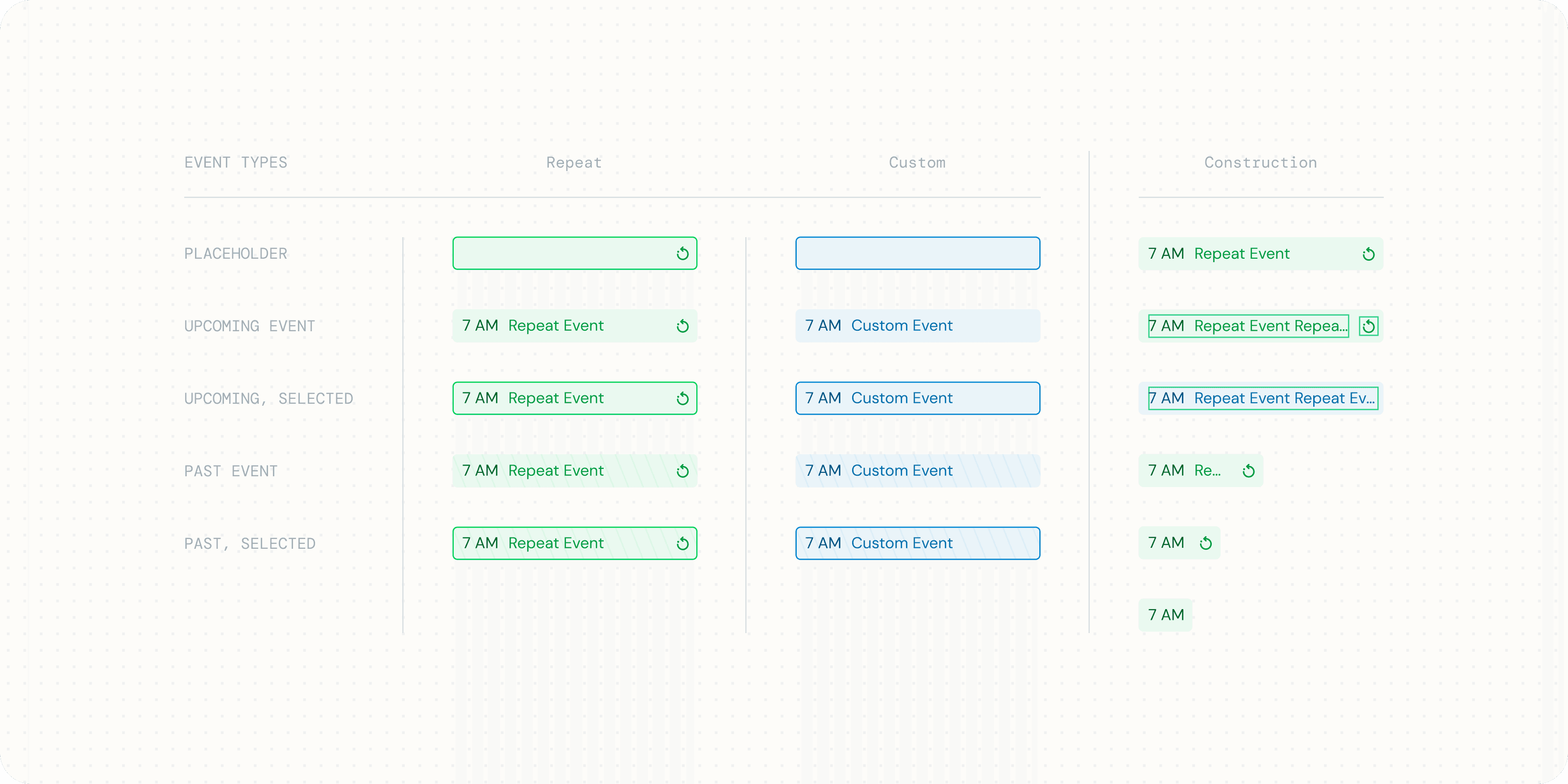 Calendar - Interior date/time rows with events. For P0, follow the way the events are placed/stacked as in the default Big React Calendar but adjust the styling based on Figma guides. There are two different types of events (a) reoccurring (b) custom.