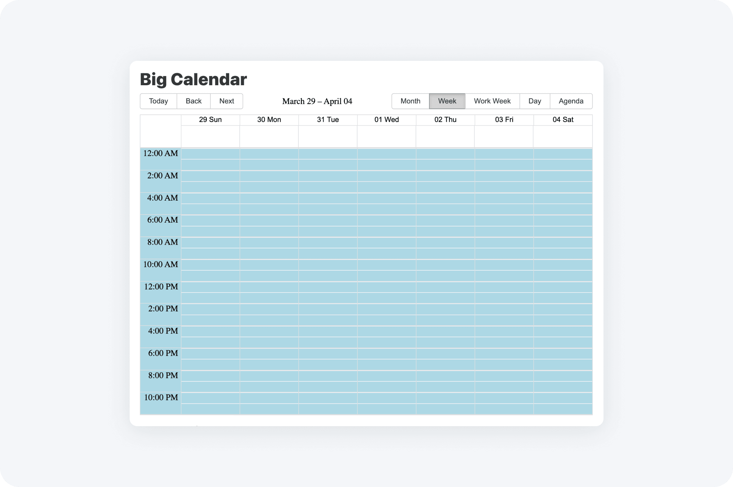 The Scheduler Calendar will be built off of the Big React Calendar. By default, it should show the current week, with the current date highlighted and a line to indicate the current time. The calendar is broken up into 4 sections: