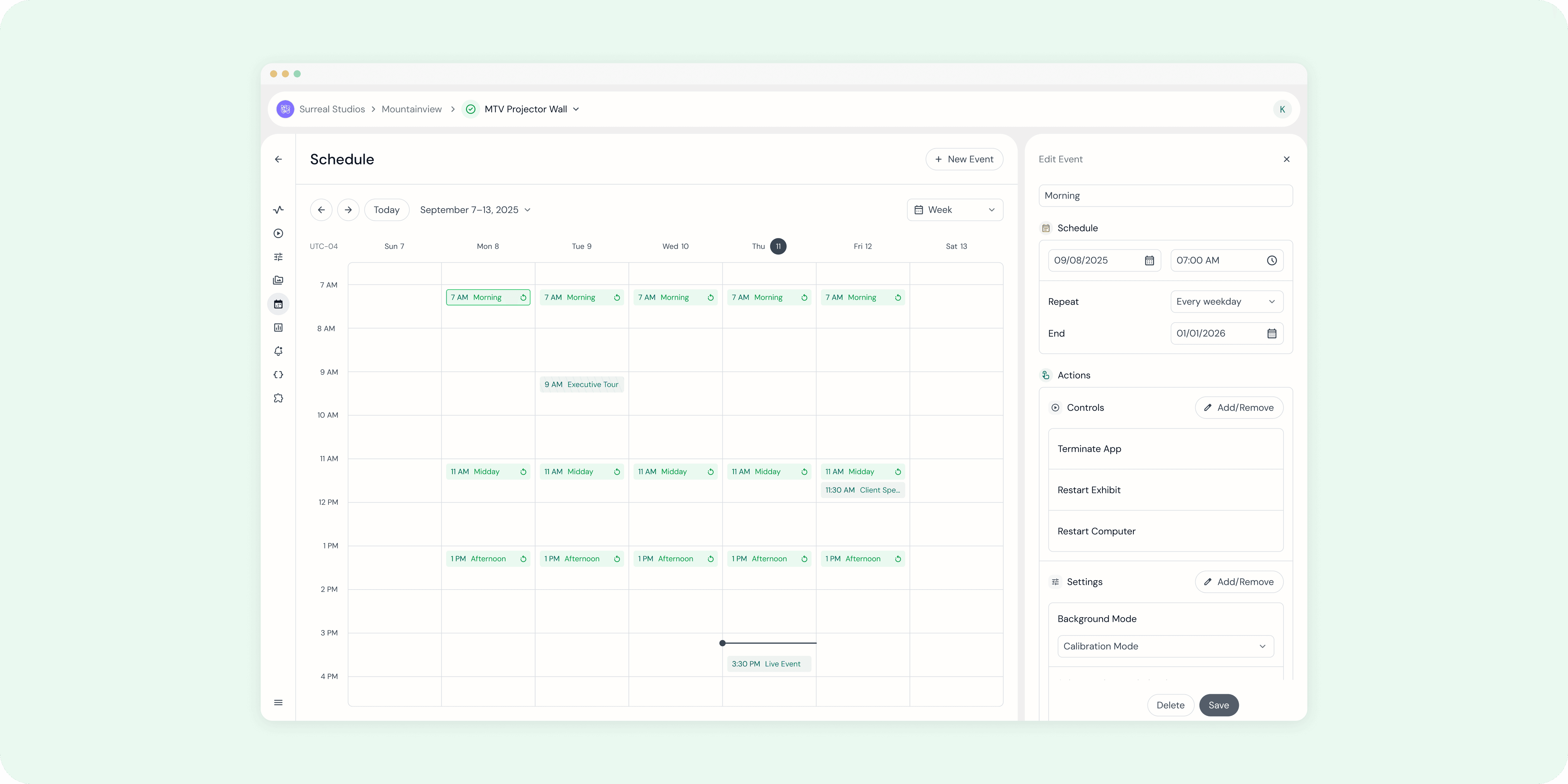 Interactive calendar to see reoccurring and custom scheduled events for tech-integrated Exhibits.